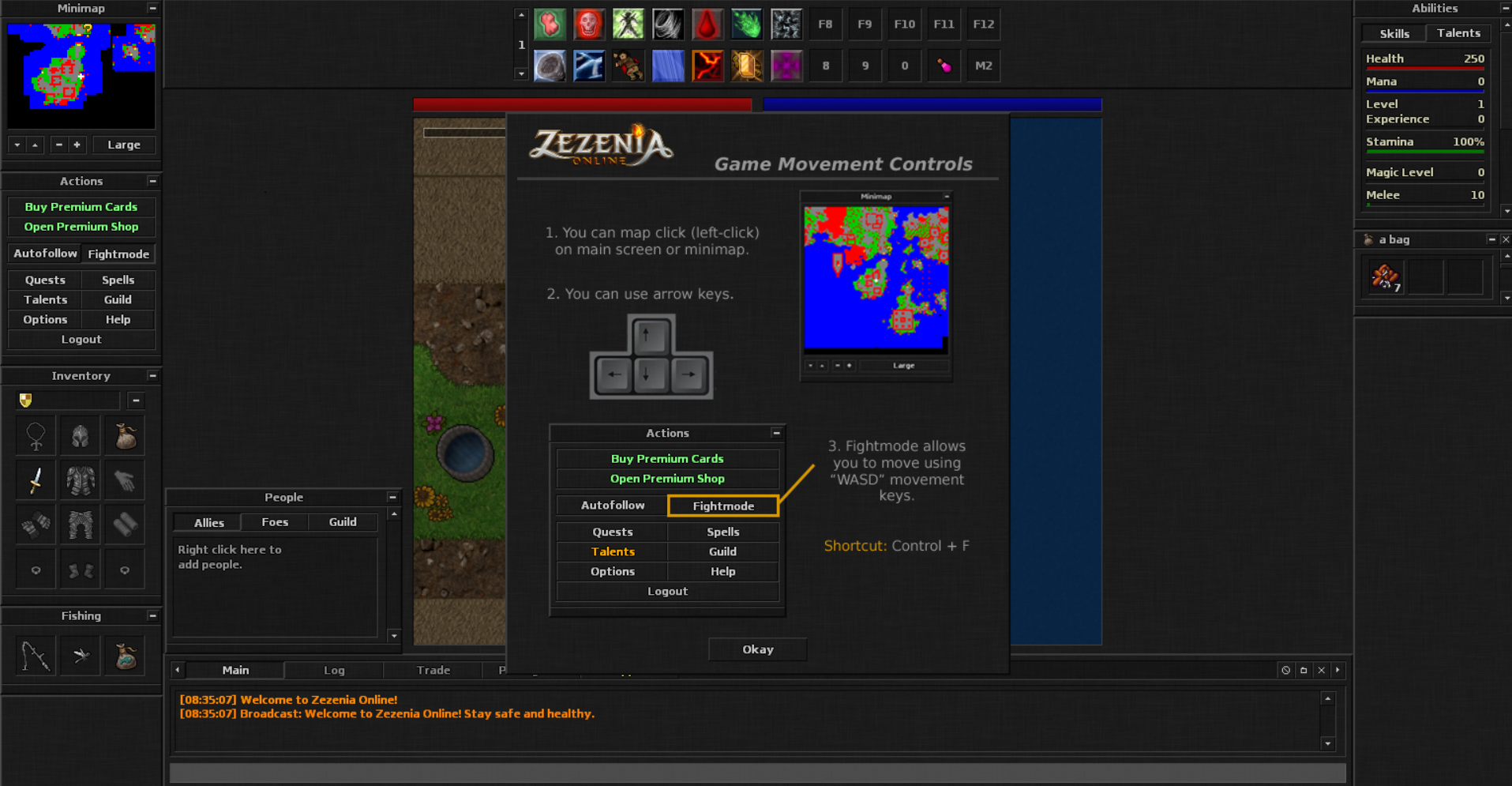 No Modo de Luta (fightmode) você pode se mover com as teclas "W, A, S, D" e lançar feitiços com as teclas 0 a 9. O bate-papo ficará desabilitado.