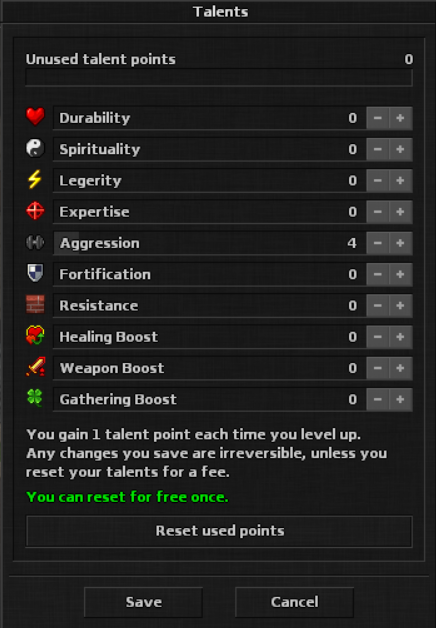 - Redefinição de pontos de talento - Você pode redefinir seus pontos de talento por uma taxa de 10 Cards. Tem uma redefinição grátis por personagem, caso deseje redefinir novamente, precisará do premium card.