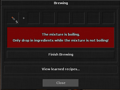 Depois disso, você deve se certificar de que possui recursos suficientes para conseguir fazer a potion. Abra a caixa de diálogo de brewing clicando com o botão direito do mouse em um caldeirão, localizado na loja de pot (subsolo), do npc Nicholas em Ellaria. Dentro da caixa de diálogo de distribuição, você pode encontrar uma sub-caixa de diálogo com uma lista das receitas que aprendeu, cada uma com sua própria lista de ingredientes necessários.
